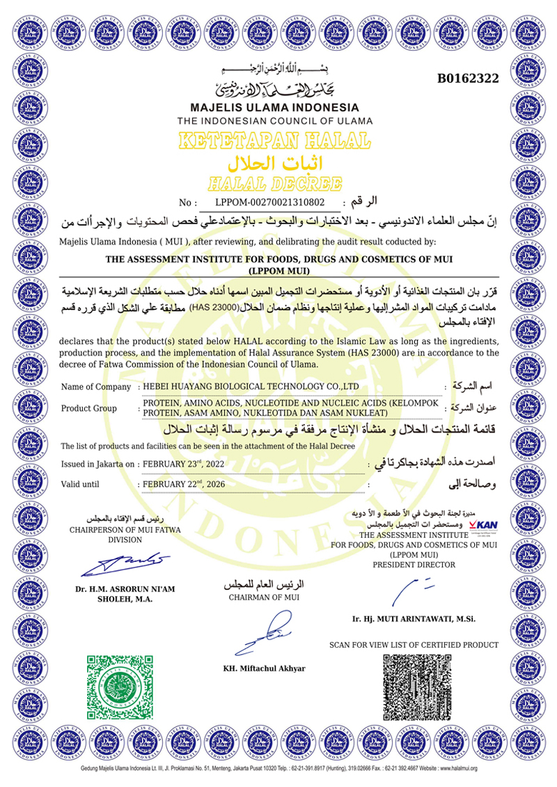 河北華陽集團坐落于河北省衡水市冀州區省級工業園區(始建于1987年,前身為冀州市華陽化工有限責任公司)。集團下屬四個公司:河北華陽生物科技有限公司、河北華悅氨基酸科技有限公司、滄州華晨生物科技有限公司、衡水市陽力商貿有限公司。主要生產甘氨酸、L-丙氨酸、L-蘇氨酸、DL-蛋氨酸、L-賴氨酸鹽酸鹽、L-半胱氨酸鹽酸鹽、干貝素等氨基酸系列食品級產品,廣泛應用于食品、飲料、飼料等行業。......